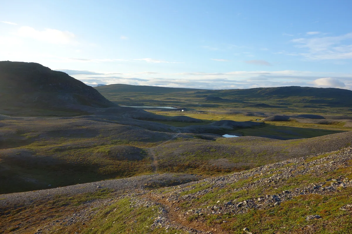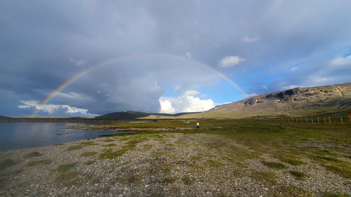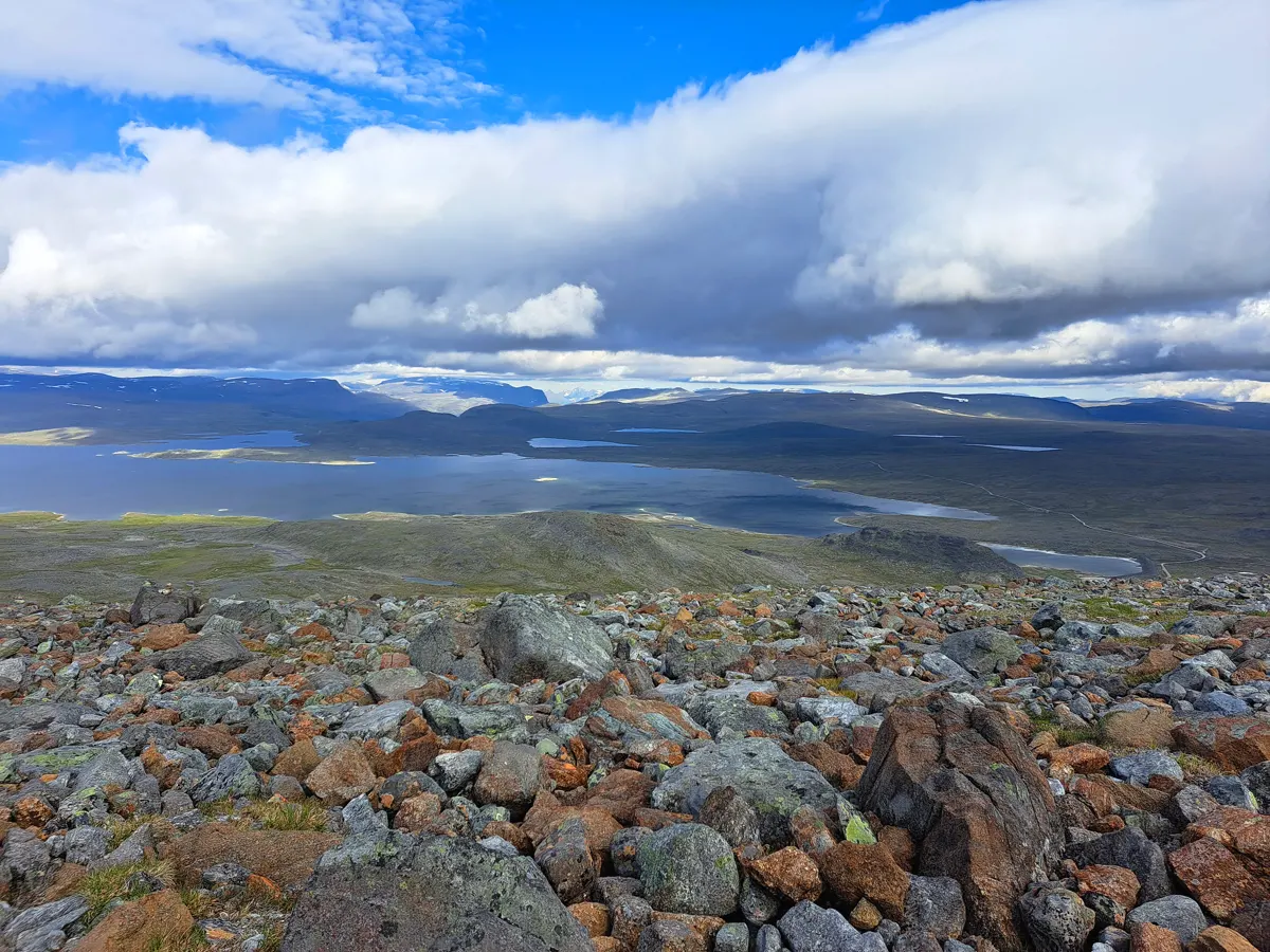 The area borders the Norwegian national park Reisa. The nearest lake visible on a clear day is Háldijávri, and if you look closely you can see the lodge on its shore. Further away in the distance you can see the larger lake Pitsusjärvi.